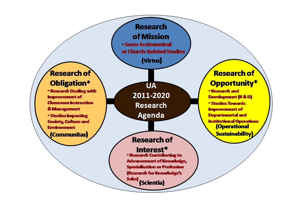 R & D is one of the means by which society can experience future growth by developing new products or processes to improve and expand the operations. Undertakings like these are in close collaboration with Department of Science and Technology (DOST), Department of Health (DOH) and Department of Energy (DoE), Department of Environment and Natural Resources (DENR),Congressional Commission on Science and Technology and Engineering (CCSTE) and research-based agencies. The University encourages research collaboration through collaboration agreements and consortia (with other schools universities). Being a member of Central Luzon Health Research and Development Consortium (CLHRDC), UA explores potential and feasible R & D projects in the field.